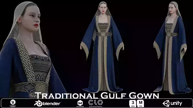 Bring cultural elegance into your project with this Traditional Gulf Gown. Designed with ornate embroidery, flowing sleeves, and authentic Middle Eastern flair, this garment is ideal for animation, cinematic scenes, or game characters that require historical or regional depth.