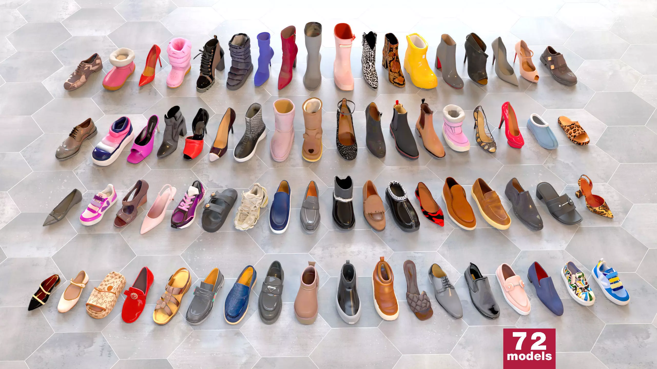 Upgrade your fashion, gaming, or visualization projects with this comprehensive 3D Shoe Collection featuring over 60 uniquely designed models. This meticulously crafted set showcases a wide variety of modern, high-detail footwear ranging from casual sneakers to high-fashion heels and rugged boots. Every model is optimized for both high-end renders and real-time applications, making them perfect for game development, animation, virtual stores, AR/VR, or fashion design.