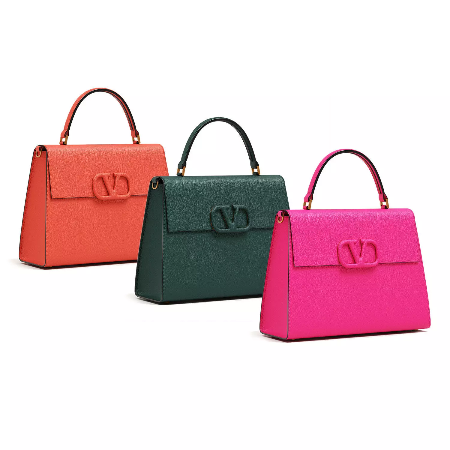 Three variants of Valentino Garavani Mini VSLING Handbag in cyclamen pink, green and orange grainy calfskin leather, with antique-brass-finish metal hardware.