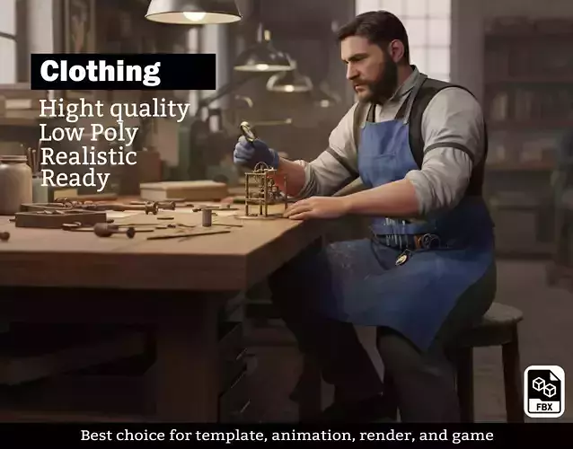 Intricate Details: The model includes modeled pocket tools, realistic leather textures on the gloves and boots, and specific wear-and-tear details on the apron for an authentic lived-in look.Narrative Rich: Ideal for historical settings, industrial revolution themes, steampunk games, or modern artisanal workshop environments.Optimized Geometry: Clean topology allows for easy rigging and animation, ensuring the apron deforms naturally with character movement.Full Accessories: Comes complete with heavy-duty gloves, work boots, vest, and armbands.