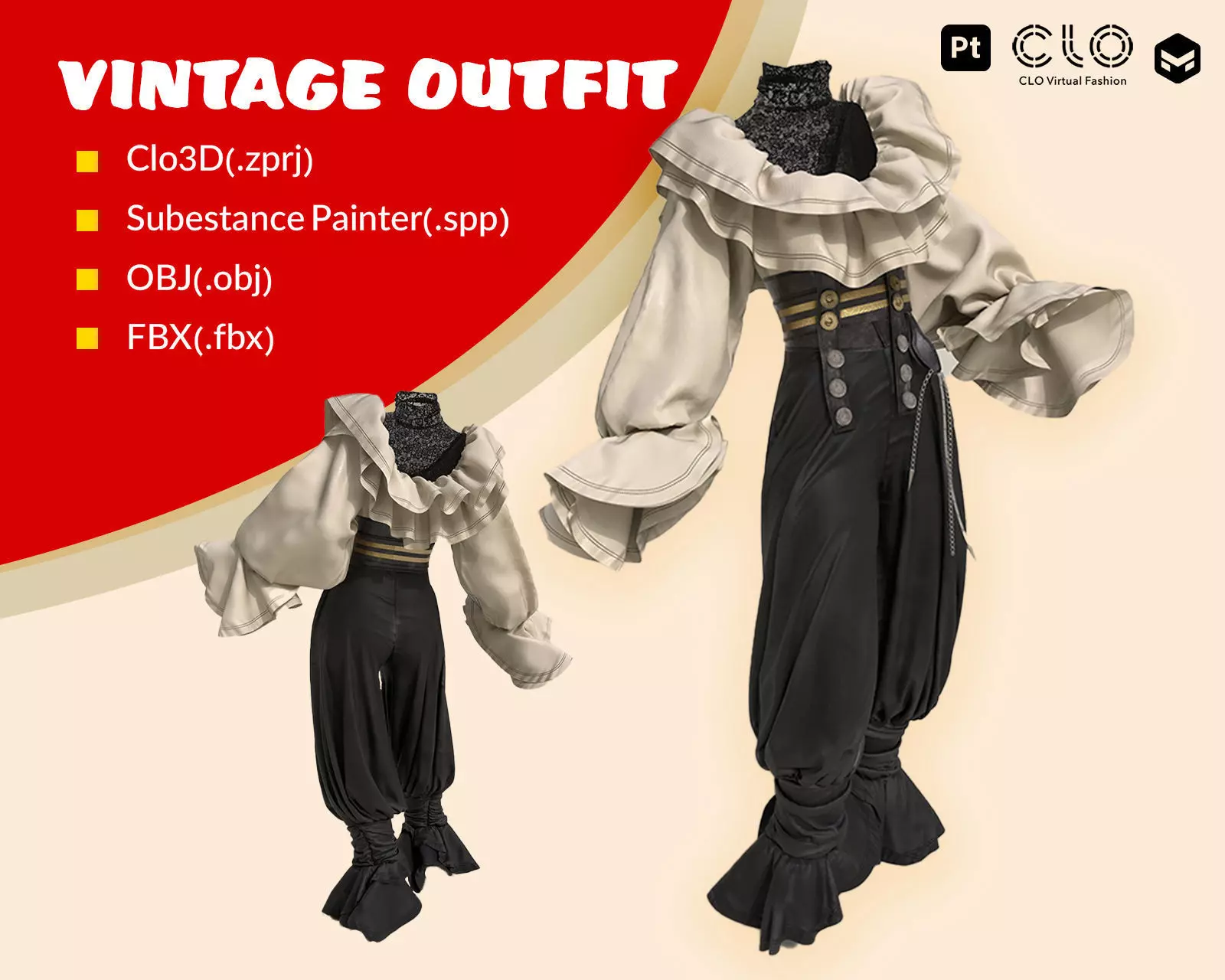 Design Software: Created in Clo3D.Texturing: High-quality materials rendered in Substance Painter.Formats Available: Comes in both OBJ and FBX formats.Pose: The model is provided in A-pose.Texture Resolution: Textures are at a crisp 4096 resolution, ensuring high detail.Mesh Details: Features square polygons for optimal texturing.Output Formats: Includes unwelded and unified texture outputs for versatile use.This 3D asset is perfect for adding a touch of vintage elegance to your digital projects, whether for games, animations, or visualizations. Available now on CG trader!