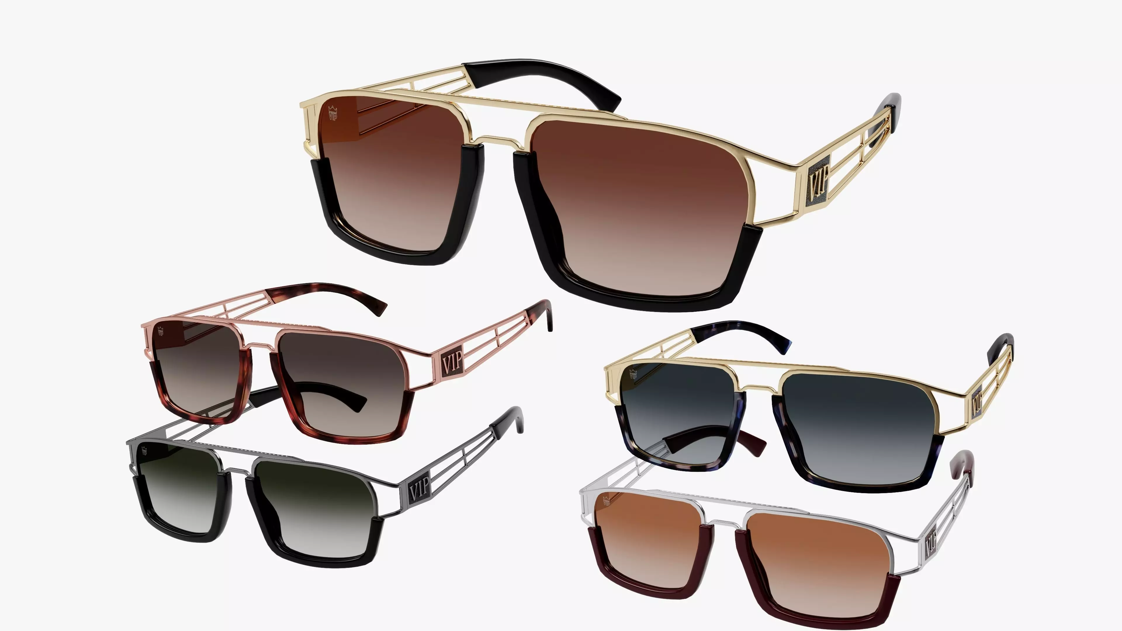 Gold, Rose Gold, Silver, Ruthenium framesAcetate arms: Classic Havana, Night Havana, Black, Dark RedGradient lenses with multiple optionsHigh-detail low poly geometry with VIP cutout logo