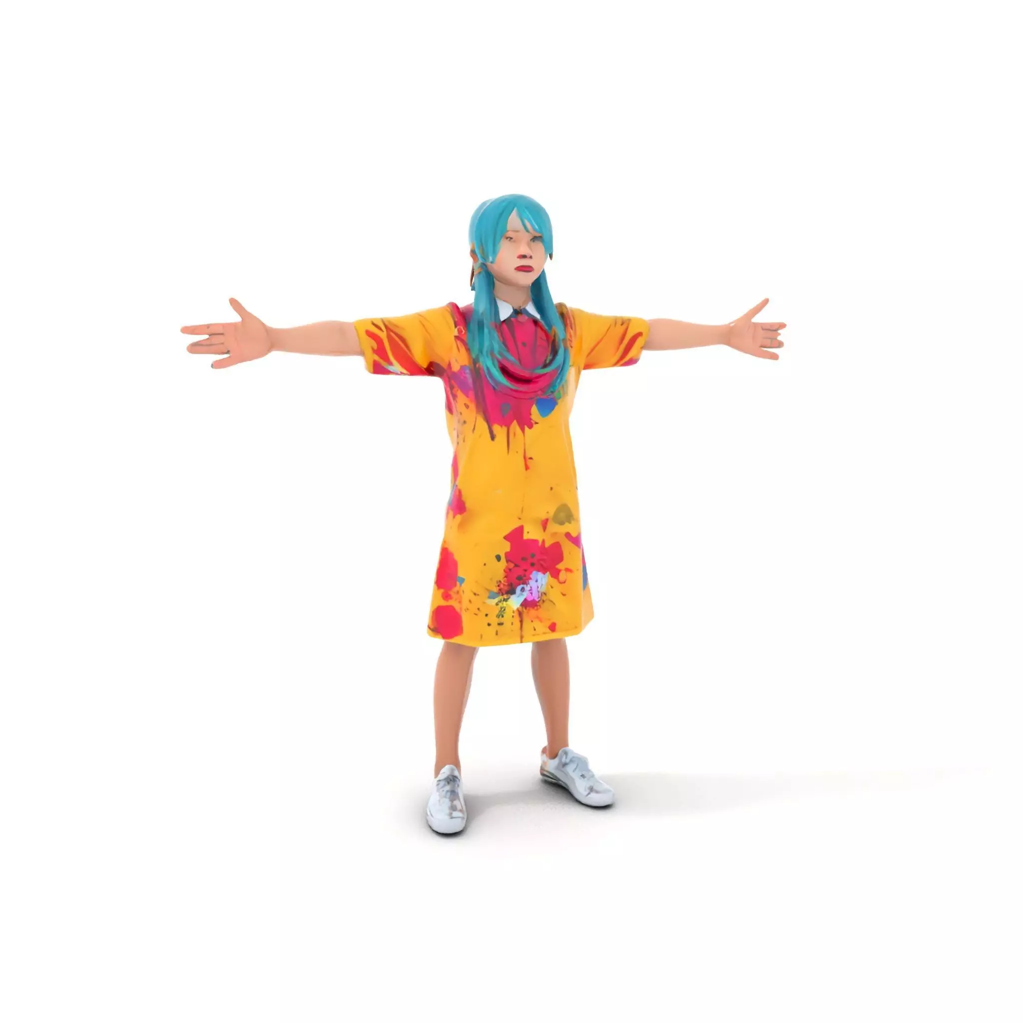 This 3D model pack features a vibrant character sporting a vivid paint-splattered dress, perfect for adding a pop of creativity to any scene. Each model has 3 levels of detail: low-poly (1000 triangles for mobile), middle-poly (10,000 triangles for environment), and high-poly (100,000 triangles), which allows for the use of this model in production rendering (such as 3ds max, Maya, Cinema4d, Blender, Vray/Corona/Cycles and all other), game engines (Unity and Unreal compatible), and interactive presentations, providing a choice of detail based on the LOD System principle.