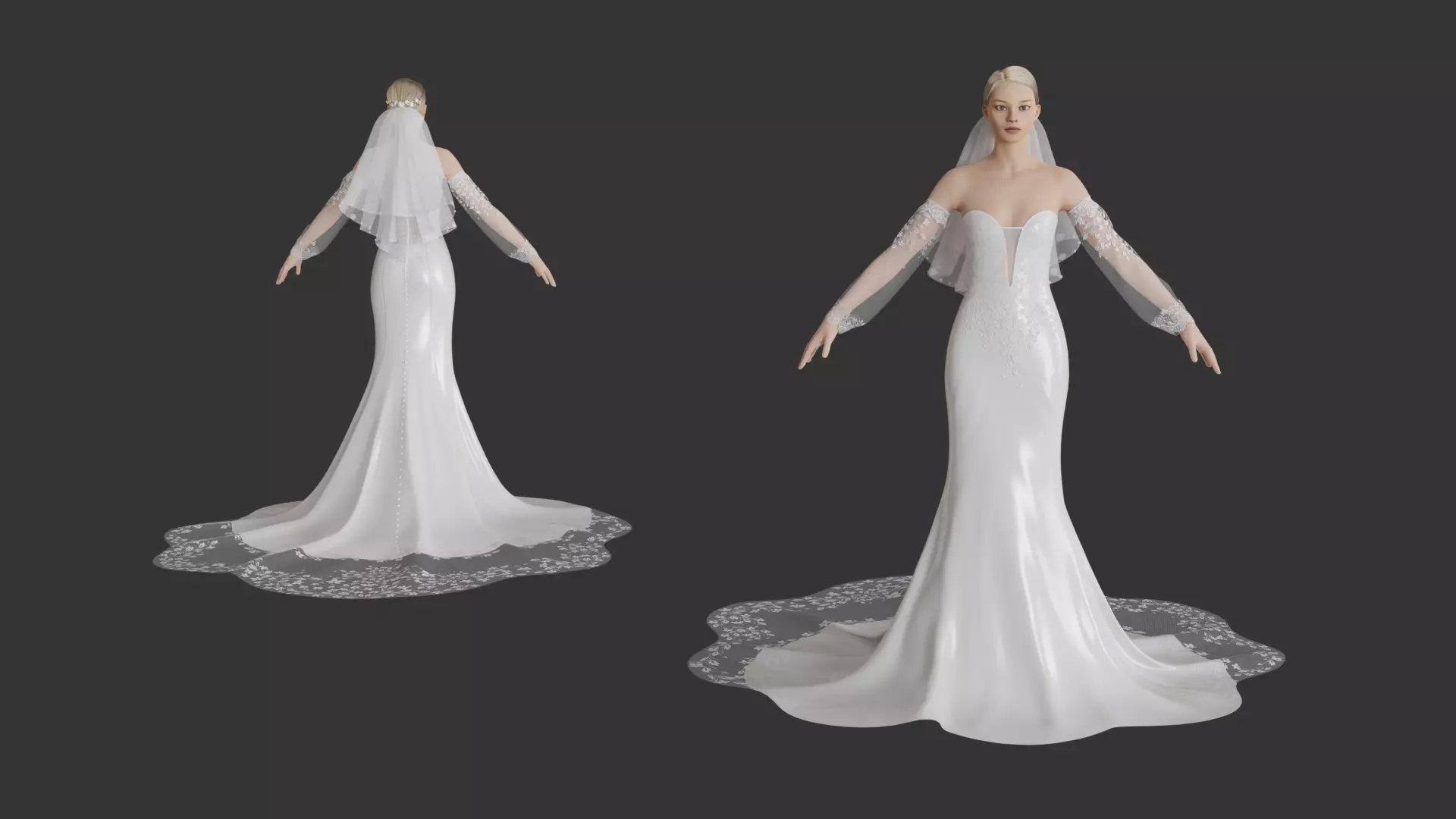 3d model of Wedding dress V.2 3d model. Woman charecter not including in file. The file was created in Blender3.0 Detailed design that allows for close-up renders. Inside the buildings looks neat aswell and clear wireframe. Uvmap is ready. Easy to adjust, Just put the model in you scene.