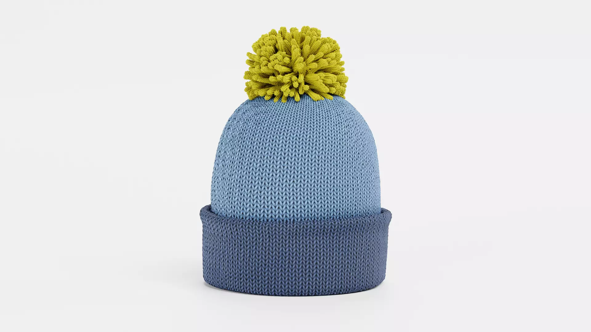 A colorful knit beanie combining dark blue, light blue, and a contrasting yellow pom-pom. Designed for scenes that benefit from a more vibrant or cheerful visual element. The material features a detailed knitted structure and a natural shape that fits well into fashion, lifestyle, or product environments. Brand-free design keeps it versatile for any commercial project.
