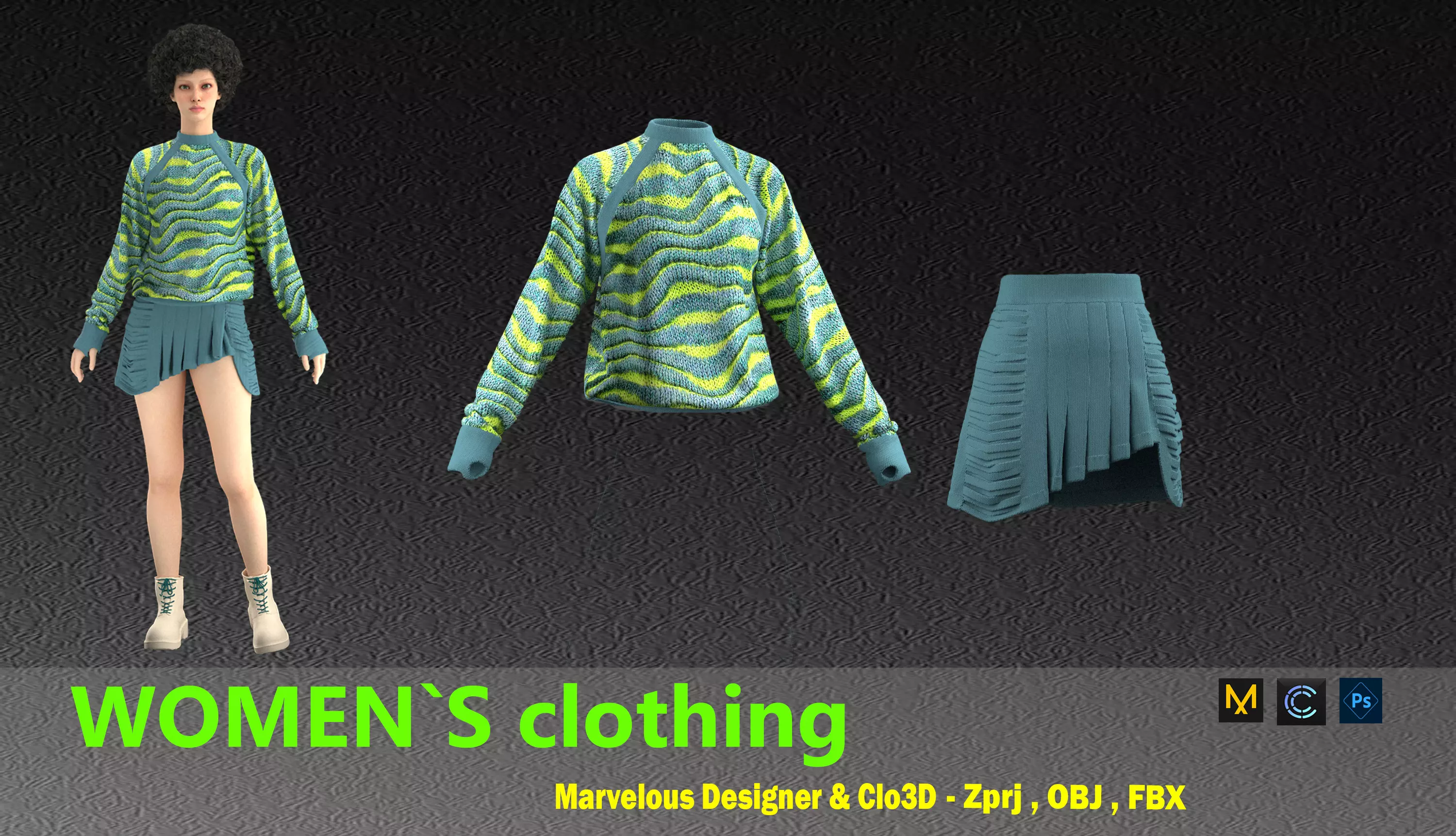 Marvelous designerProject. Made in Clo3d 7.0 models is available in the ( obj, fbx, zprj , png, uv ) files. the product comes with texture and normal map. the product is Quad mesh and particle distance in marvelous designer and clo3d is set on3. this product is designed in clo3D and text rendered in clo3D. overlapping UV.