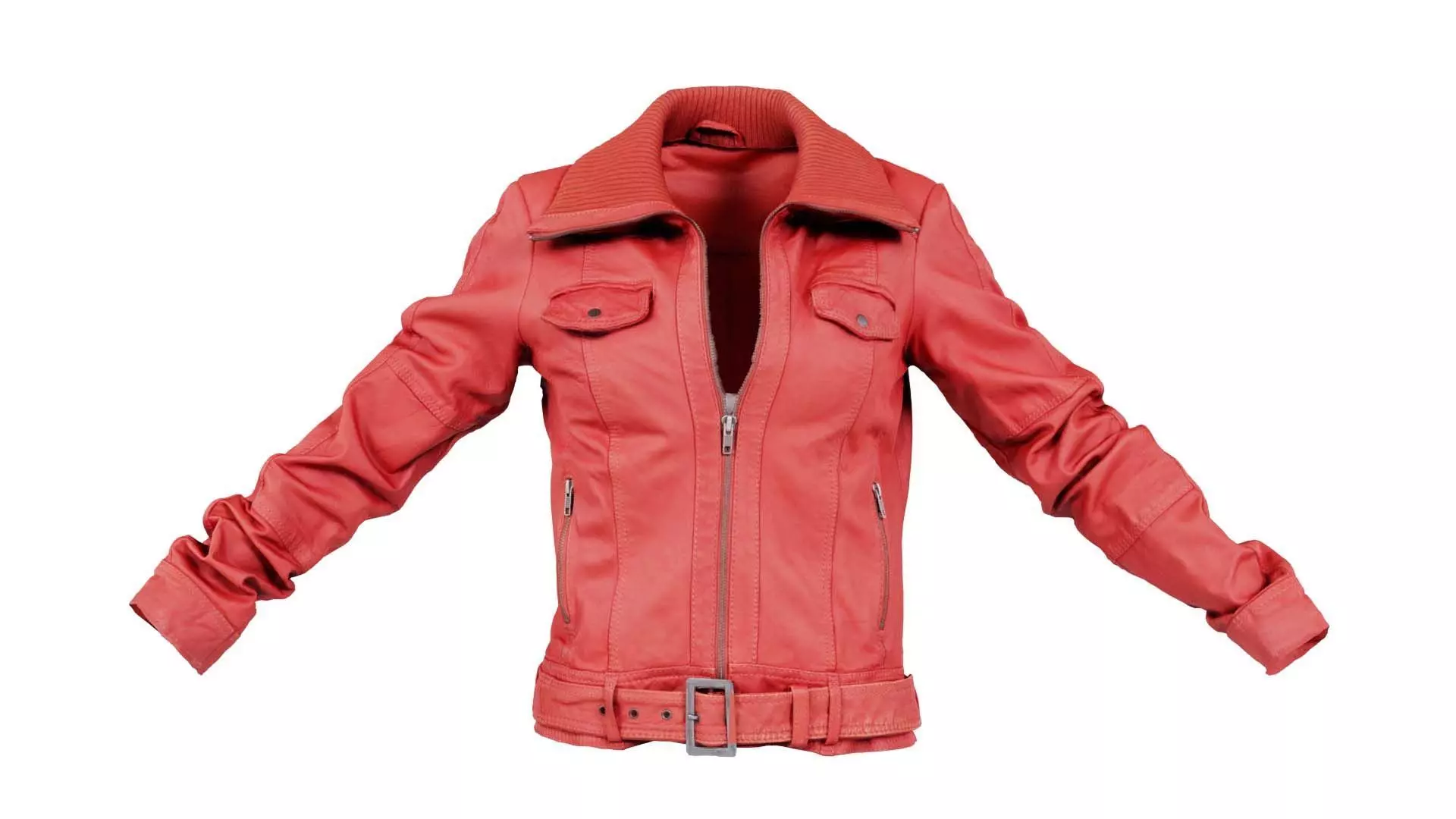 3D scanned model featuring a red leather jacket with zippers on the sleeves. This model, wool collar leather jacket, has been created using photogrammetry from a real world object.The raw scan data has been cleaned, retopologized and UV-unwrapped using Zbrush. The result is a low poly mesh with baked maps. The .obj and .mtl are configured so that maps will load automatically in the shader (tested in Blender). In addition, a Blender scene is provided with the model and shader already set up for rendering and export. Detailed information below: