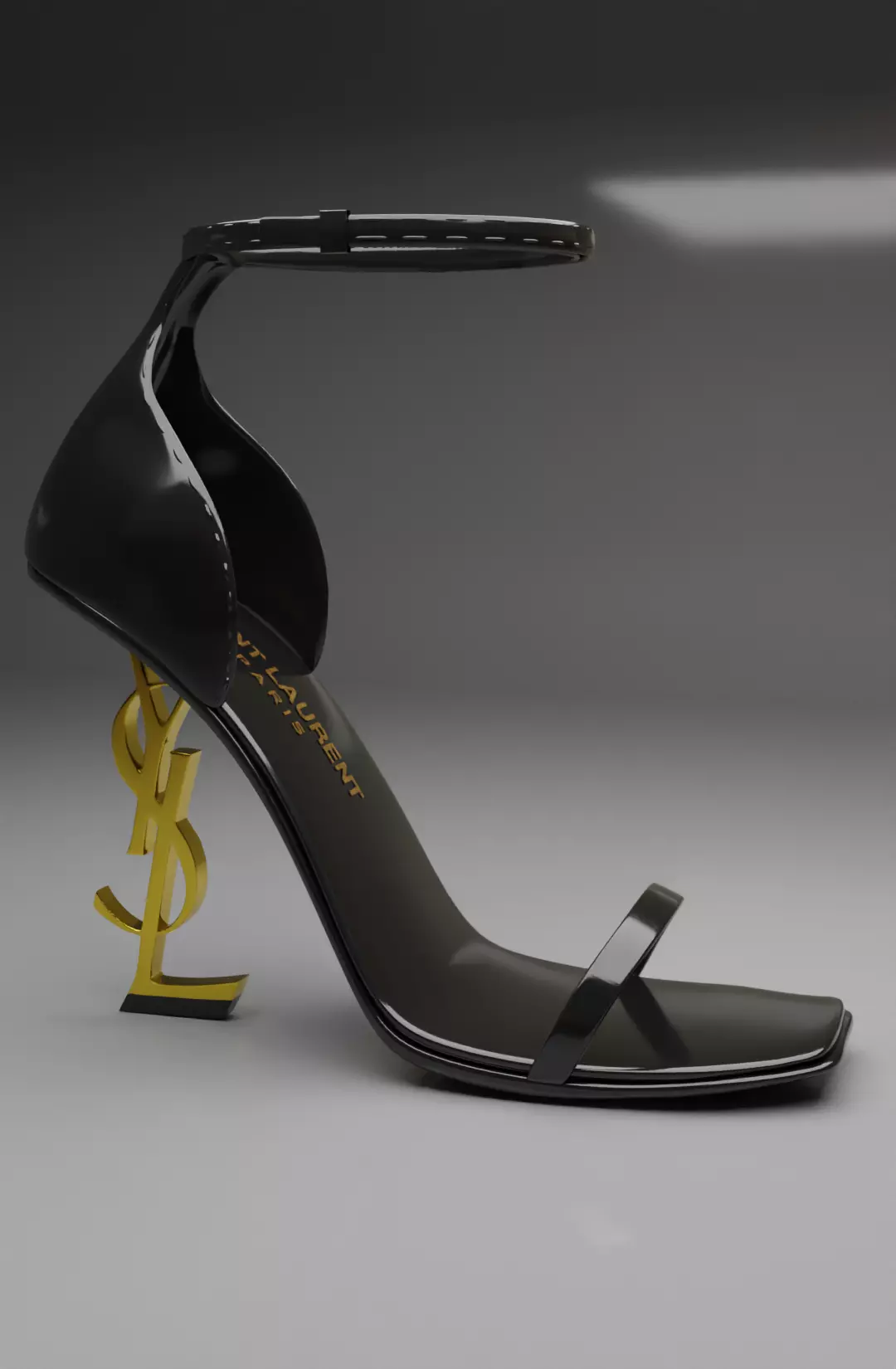 This 3D model showcases a high-heel shoe with a luxury aesthetic, expertly modeled by Priska. The design features a sleek, minimalistic upper with an ankle strap and toe strap, embodying a modern, sophisticated style. The standout feature is the unique heel, crafted in the form of the iconic YSL logo in a golden metallic finish, giving the shoe a distinct brand identity and making it a statement piece.