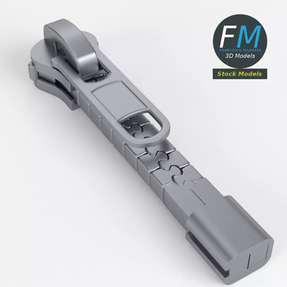 Zipper (zip) fastener 3D Model, nr. 1 in my collection. 3 individual objects (cap, teeth, end), sharing the same non overlapping UV Layout map, Material and PBR Textures sets. Production-ready 3D Model, with PBR materials, textures, non overlapping UV Layout map provided in the package.Quads only geometries (no tris/ngons).Easily customizable: UV unwrapped geometries, so you can create new Textures (or modify the existing ones) using the UV Layout maps provided in the package (as png with alpha).Each Object, Material or Texture provided in the package has a unique, meaningful name.Made in Blender (Cycles / Eevee materials) then exported to OBJ and FBX; materials and textures made in Substance Painter, exported for PBR, V-Ray, Unity, Unreal.PROMO IMAGES: the first image has been rendered in Cycles (or Eevee) for Blender; in particular, you can find 11+ promo images in this description: