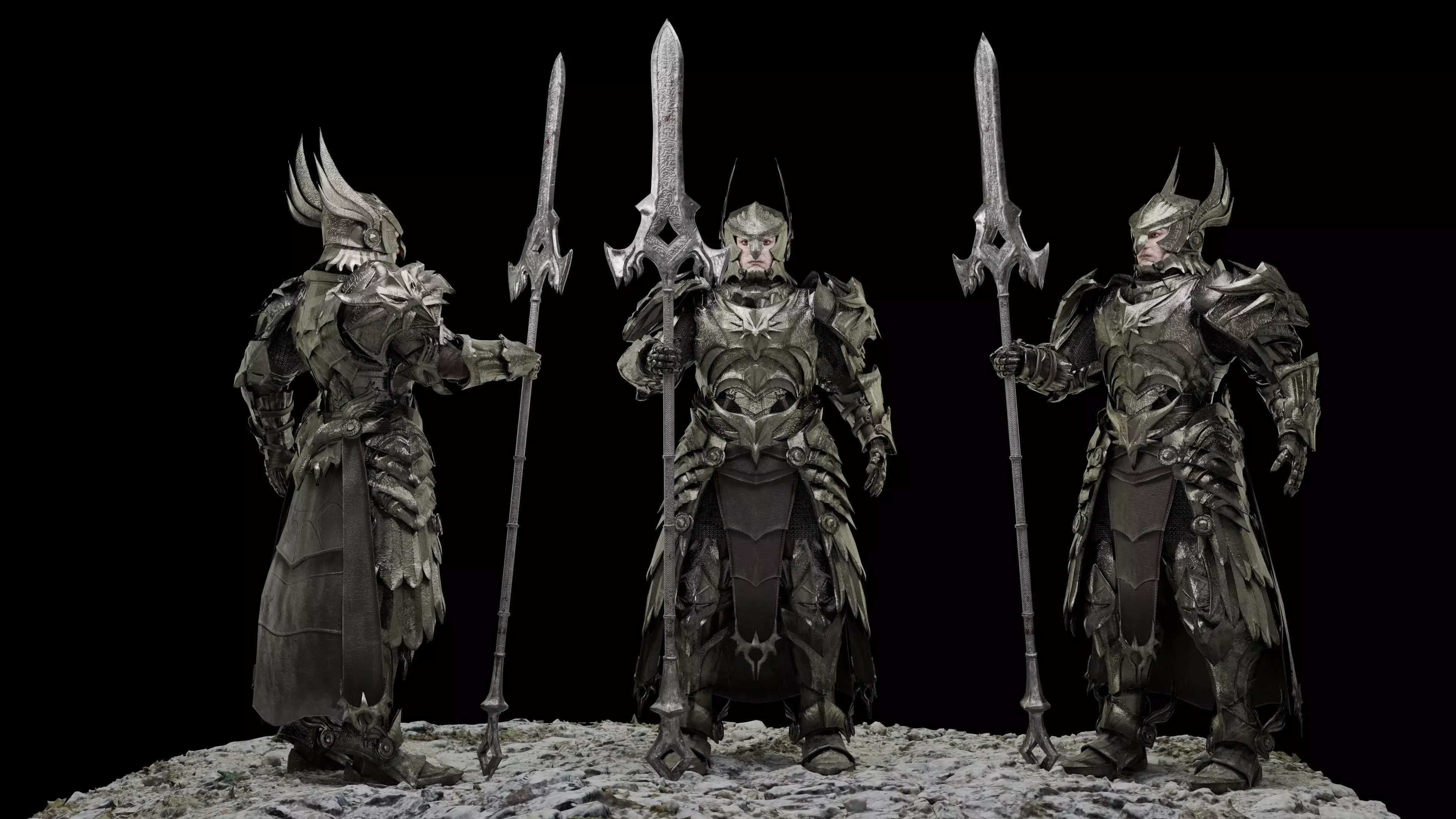 Full armor set with detailed design: winged helmet, layered pauldrons, segmented plates, cloth parts, and weapon (spear).