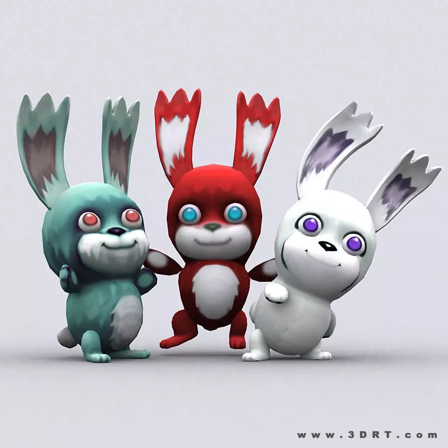 Chibiimon Bunny cartoon character model.3 skins.1024x1024 .tga diffuse and normal textures.2 LODs.Triangles count: low/high LOD.