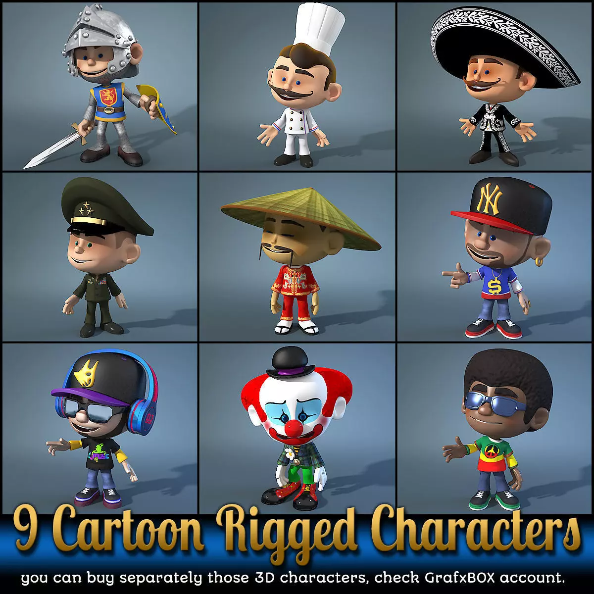 _9 Scenes in 3ds Max. 2014 format, with Standard 3ds Max. materials. Rigged with Biped system and Skin modifier. About 3000/4000 polygons with TurboSmooth OFF. Facial animation is controlled with morph targets, 2 basic expressions, 'Neutral, Happy, Hangry' (see examples in previews). You can create easily your owns expressions by extracting heads. Eyebrows controlled with 2 morph targets (Neutral, Happy and Hangry).