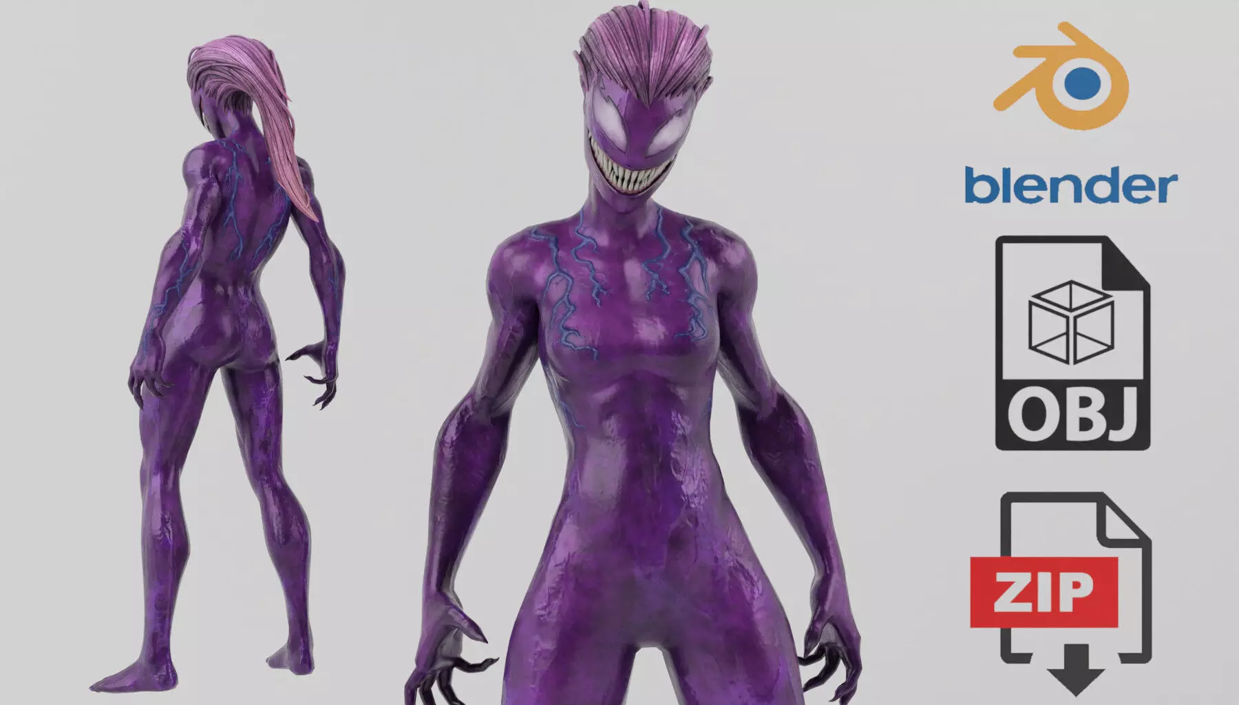 Detailed low-poly 3D model of the Agony Symbiote, a visually striking character design with its signature vibrant purple tones and alien aesthetic. This model is optimized for animations, and VR/AR projects. Perfect for use in creative projects requiring unique symbiote characters or sci-fi themes. Available in multiple formats for compatibility with popular 3D software.