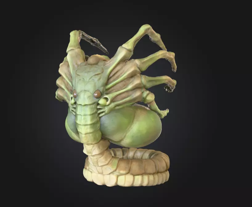 The texture of its body tells its own unsettling story: slick, glistening membranes stretch across its exoskeleton, reflecting a strange bioluminescent sheen of green and gold. The abdominal sacs pulse with faint life, suggesting alien biology that operates beyond human comprehension. The creature’s coiled tail, thick and muscular, serves both as anchor and weapon—evidence of a species evolved to dominate through stealth and survival.