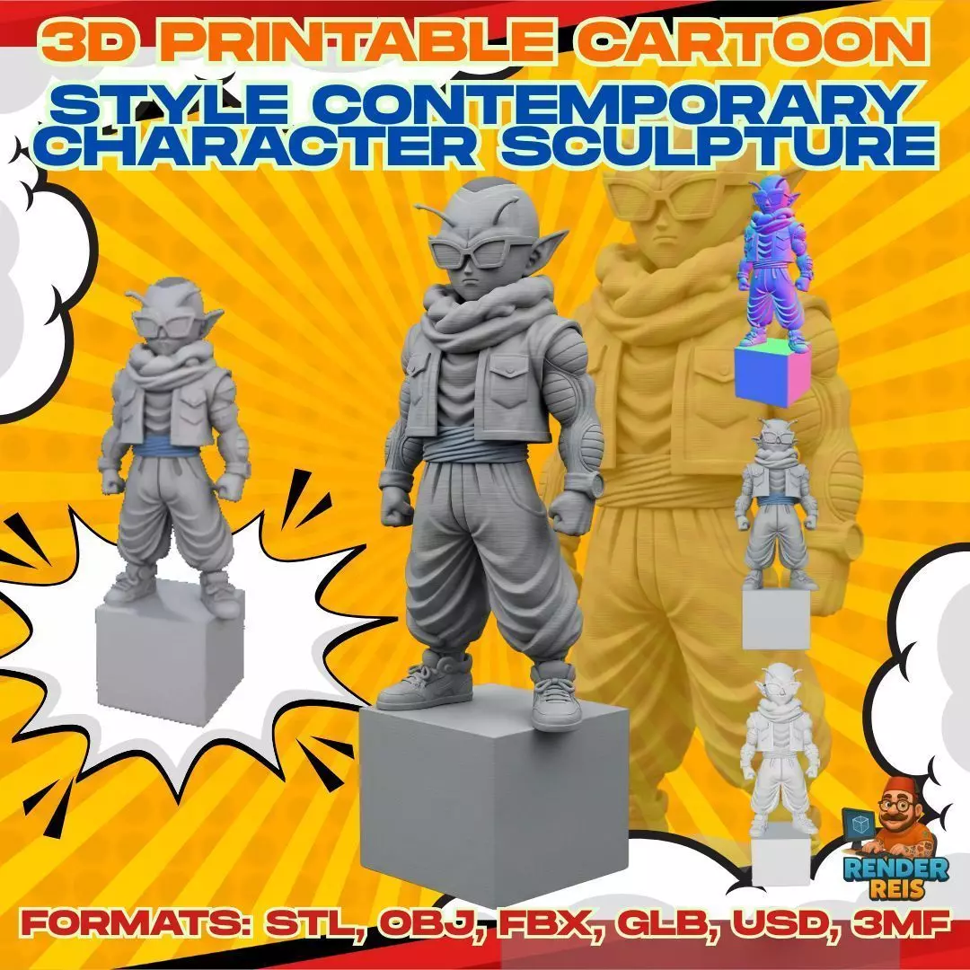 This unique 3D printable model features a stylized alien warrior with antenna-like head protrusions, distinct ears, and oversized sunglasses. Combining urban fashion with sci-fi elements, the character wears a short jacket and a thick scarf, with armored forearm details that enhance his battle-ready presence. Baggy pants and sporty sneakers complete the modern aesthetic, while the figure stands tall and balanced on a minimal cube-shaped base.Perfect for anime and manga fans, this figure can be customized with paint or displayed raw as a bold collectible.