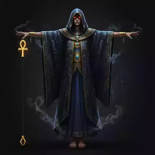 A powerful Ancient Egyptian Mystic / Sorcerer character designed for mystical games, dark historical narratives, and cinematic fantasy productions.This tall and mysterious figure (male or female) is presented in a clean, symmetrical T-Pose, front view, ensuring smooth rigging, animation, and real-time engine integration.