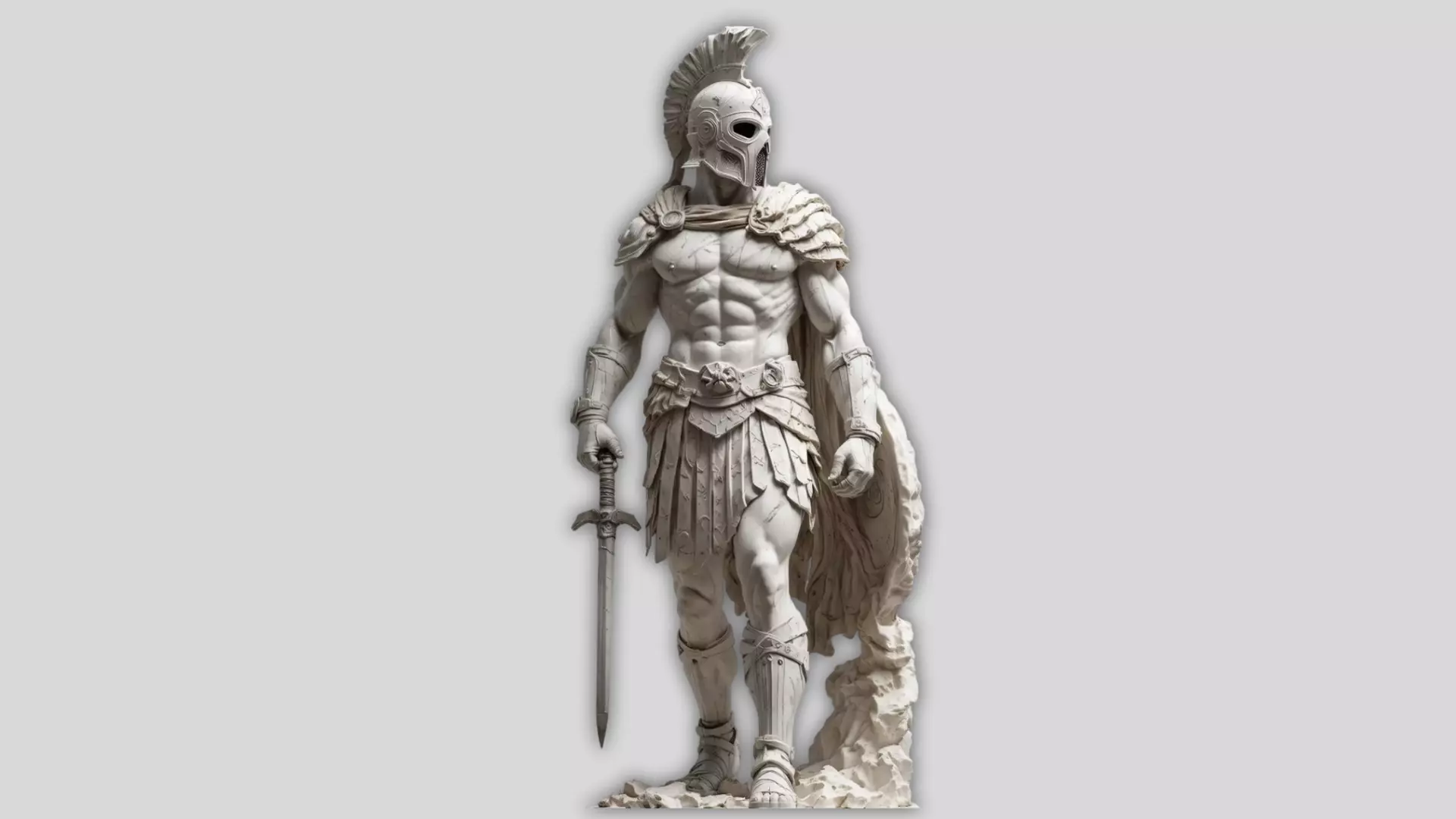 This highly detailed ancient Greek Spartan warrior statue 3D model represents a classical heroic soldier inspired by traditional marble sculptures and mythological warriors from ancient civilizations. The statue features a powerful athletic anatomy, a traditional Spartan helmet with crest, layered armor elements, and a heroic standing pose holding a sword. The sculpt captures the essence of ancient warrior culture and classical artistry, making it ideal for historical scenes, fantasy environments, and collectible figurine projects.