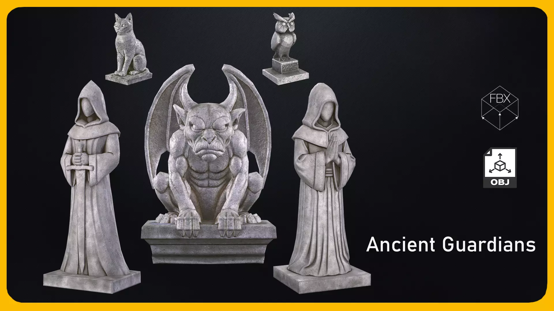 The Gothic Fantasy Statue Collection includes five stylized stone sculptures designed for medieval and dark fantasy environments.