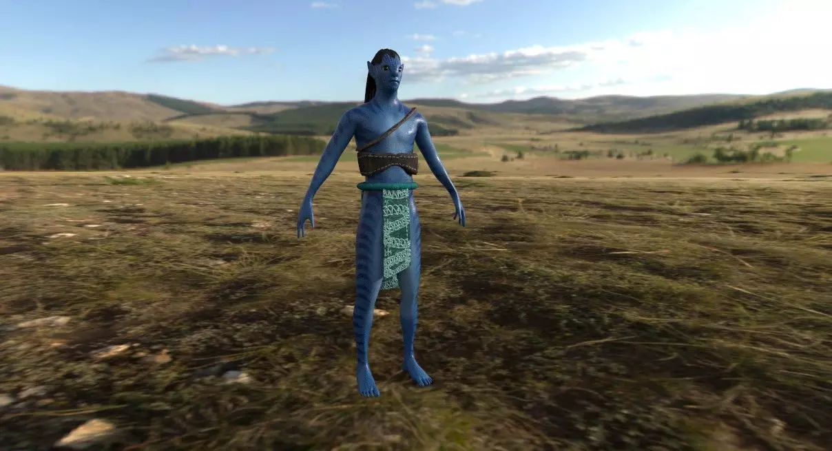 The character is a tall, slender Na’vi-inspired Avatar, with deep sapphire-blue skin adorned with bioluminescent patterns that subtly glow. His elongated limbs and toned, athletic physique give him a graceful yet powerful presence. His face features high cheekbones, feline-like yellow eyes, and pointed ears that twitch slightly, enhancing his keen senses. His dark hair is intricately braided, with some strands woven into a traditional queue, a biological connection used by the Na’vi. He wears a tribal-style loincloth with intricate glowing patterns, fastened by a sturdy belt with a circular ornament, and a leather chest strap crossing diagonally over his torso. His long, prehensile tail sways gently behind him, balancing his movements. His hands and feet are larger and more elongated than a human’s, ending in four fingers and toes, adapted for agility in his natural environment. His entire presence exudes a deep connection to nature, embodying the essence of the Na’vi people—graceful, strong, and in perfect harmony with his surroundings.