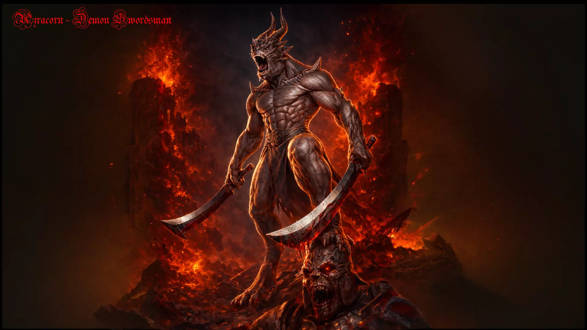Azracorn — Lord of Horns, Devourer of StormsA demon swordsman whose blades slice through chaos, and whose horns tear fear itself. Wherever he steps, fire and storm merge into a single whirlwind — and only the truly brave can withstand his gaze.