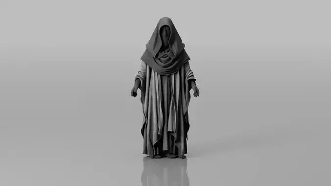The character is dressed in a full-length hooded robe with layered fabric and controlled wear details, fully concealing the body while maintaining a strong and unsettling silhouette. The design avoids exposed anatomy, gore, or exaggerated horror elements, relying instead on atmosphere, form, and shadow to achieve a frightening appearance. Clean anatomy and controlled detailing make the model well suited for real-time engines and efficient rendering pipelines.