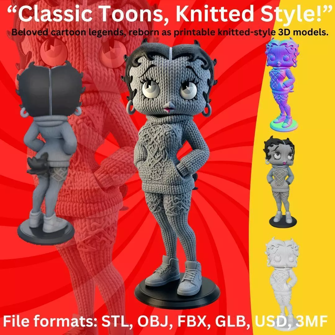 This 3D printable model is a modern and stylized take on Betty Boop—one of animation’s most iconic and recognizable female characters. Her signature big eyes, curled lashes, pouty lips, and wavy short hair are faithfully captured. Modern touches like a knitted sweater, leggings, and sneakers lend the model a contemporary designer toy feel while preserving her vintage feminine charm.