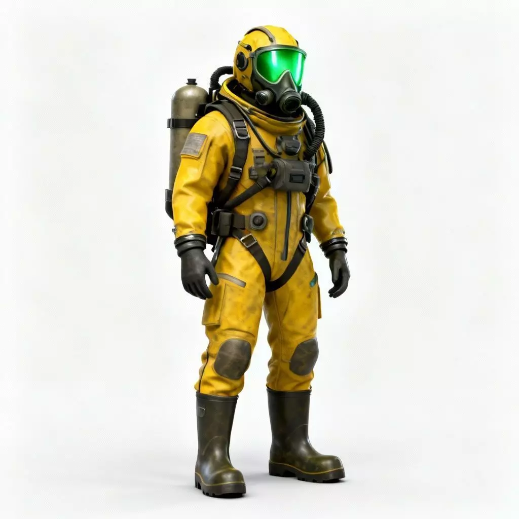 Reinforced Hazmat Suit: The character wears a bulky, bright yellow chemical protection suit featuring realistic fabric folds and heavy weathering/grime textures.
