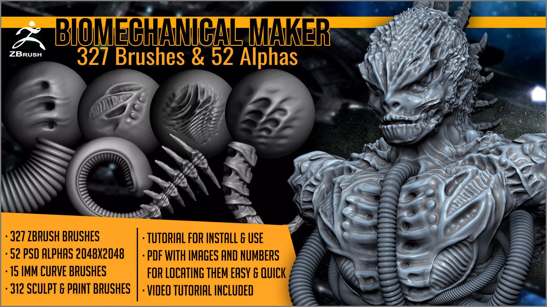 Biomechanical Maker is a set of 327 brushes and 52 alphas for sculpting, detailing and painting sci-fi monsters, biomechanical creatures, biological androids, science experiments, fantasy creatures, alien horrors, beings from other worlds, and more.