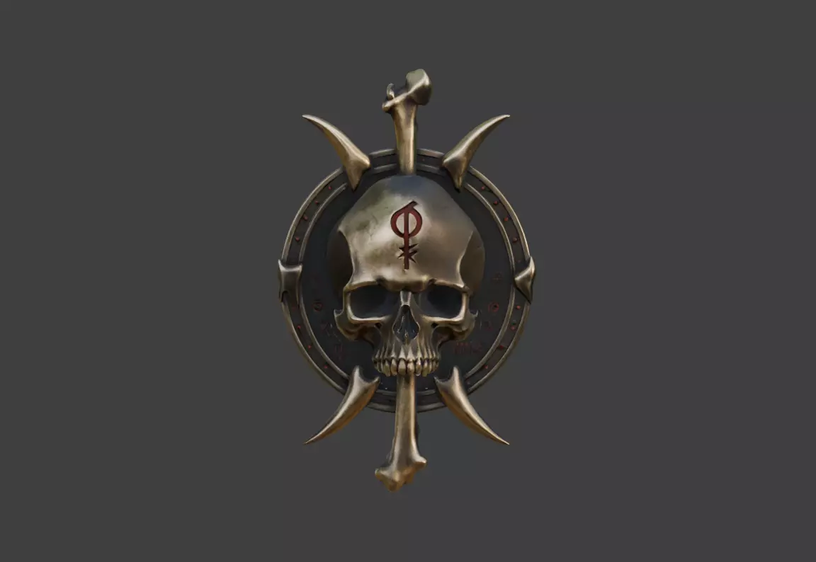 Behind the skull lies a circular sigil ring etched with arcane markings and runic symbols, hinting at demonic contracts, soul-binding rituals, or ancient cult traditions. The muted metallic tones combined with bone textures create a cold, ominous presence, while subtle wear and aging reinforce the idea that this sigil has been used repeatedly in dark rites across forgotten ages.
