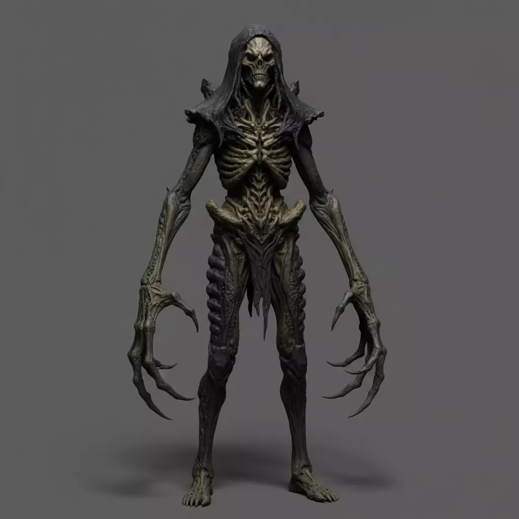The Bone Wraith Stalker is a terrifying undead creature designed for dark fantasy, horror, and sinister RPG environments. Its skeletal visage is framed by a shadowed hood, giving the impression of a necromantic assassin or a creature born from curses woven in ancient tombs. Its elongated limbs—twisted bone fused with decayed sinew—create a silhouette that is both unnatural and predatory, perfect for instilling dread in any scene it inhabits.