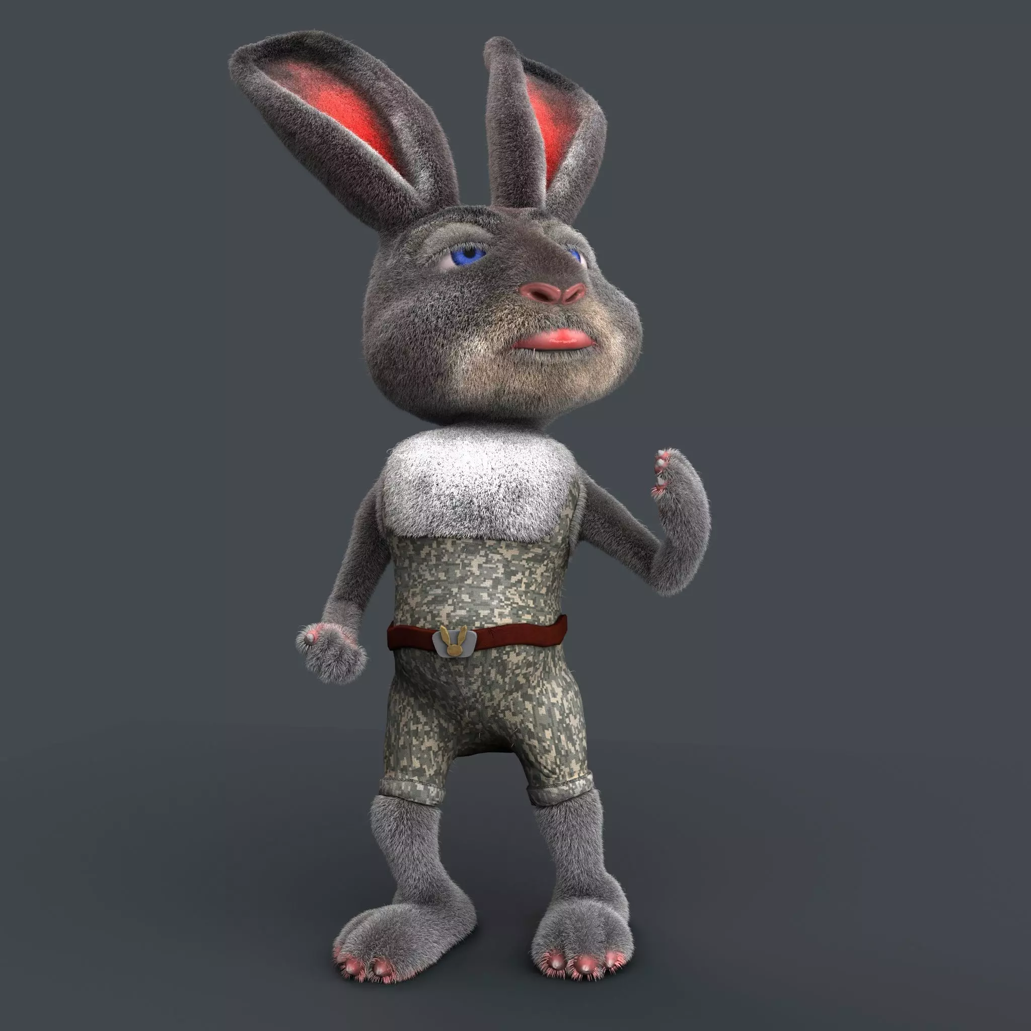 3d model cartoon rabbitFur- ornatrix Include hair cut and hair lenth map (if you use another fur generator (like standart hair&fur))Render and materials - redshift, but if you use v-ray (or another) it is not problem, because there are all maps what you need: clothes and body diffuse, normal, reflect (all maps - 2k)There are 3 morphs - happy, angry, sorrowRigged (see video)Rigged all pats of body (Even the uvula :) )