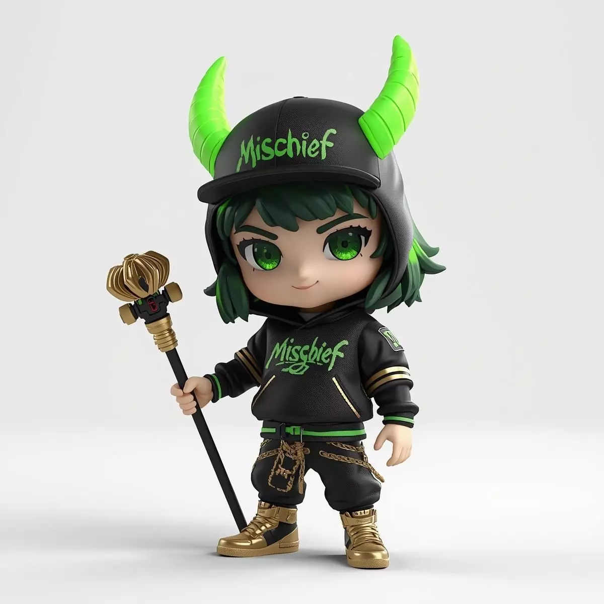 The model depicts a small, stylized figure of the trickster god Loki, featuring vibrant green hair and eyes. He is styled in street gear: a black hoodie and cap combo emblazoned with the Mischief tag in neon green. Bright neon green horns sprout from his cap, and his black outfit is accented with intricate gold details, chains, and chunky gold sneakers. He holds a detailed black and gold scepter with a crown pommel, symbolizing his desire for power.