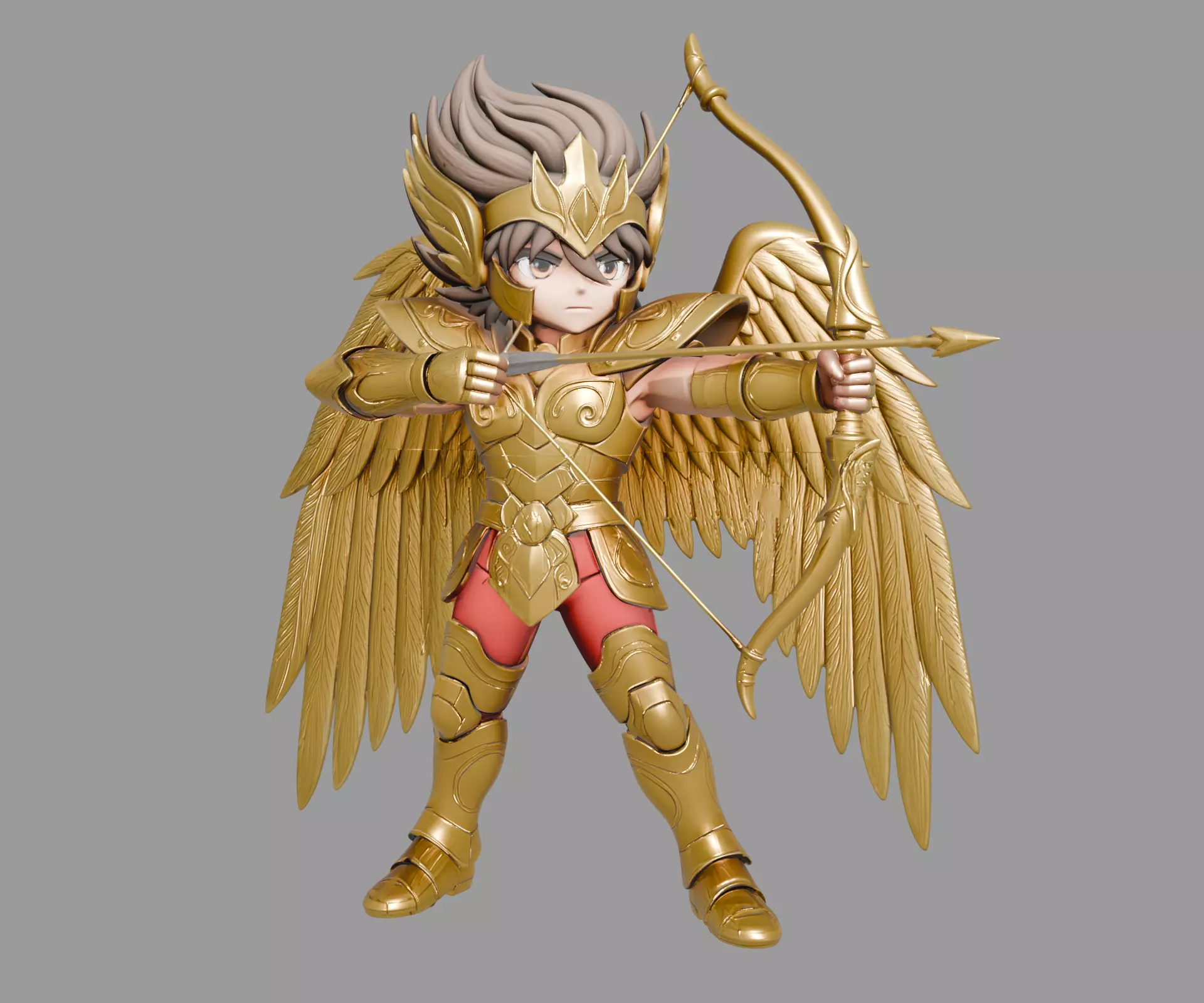 This is a Chibi Sagittarius Gold Saint Figure, a high-detail 3D model and premium collectible design inspired by the legendary Saint Seiya anime franchise. It features a dynamic combat-ready pose, intricately sculpted metallic gold saint cloth armor, realistic layered feathered wings, and a fully detailed bow and arrow, all rendered in a beloved chibi art style. Optimized for 3D printing, anime figure production, digital art, and game asset development, it is the perfect piece for Saint Seiya fans, anime collectors, and 3D printing enthusiasts.