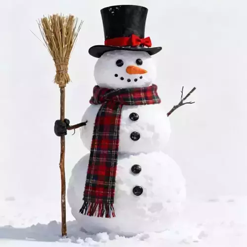 Rustic Broom Held in the right hand is a vintage-style broom made of bundled straw and a rough wooden handle. This prop completes the silhouette and suggests the snowman was just built by children using household items.