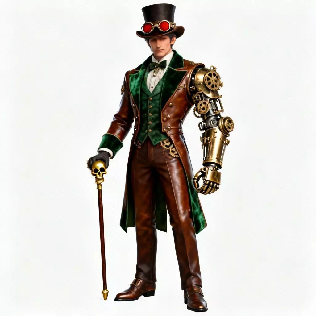 Brass Automaton Arm The most striking feature is the intricate mechanical left arm. Crafted from weathered brass and steel, it features visible gears, pistons, and hydraulic tubes. This clockwork limb suggests a character who has sacrificed humanity for technological perfection, providing a heavy, industrial contrast to his refined clothing.