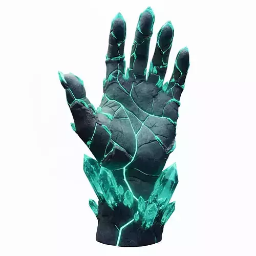 The Crystalline Touch is a mesmerizing 3D sculpture that merges organic anatomy with the raw beauty of elemental energy. Shaped as a human hand rising from stone, its surface is fractured and veined with radiant turquoise light — as if molten crystal flows beneath its hardened shell. Jagged clusters of glowing minerals emerge from the wrist and base, amplifying its supernatural aura. The contrast between the rough stone texture and the translucent crystalline structures evokes a sense of ancient magic and restrained power.
