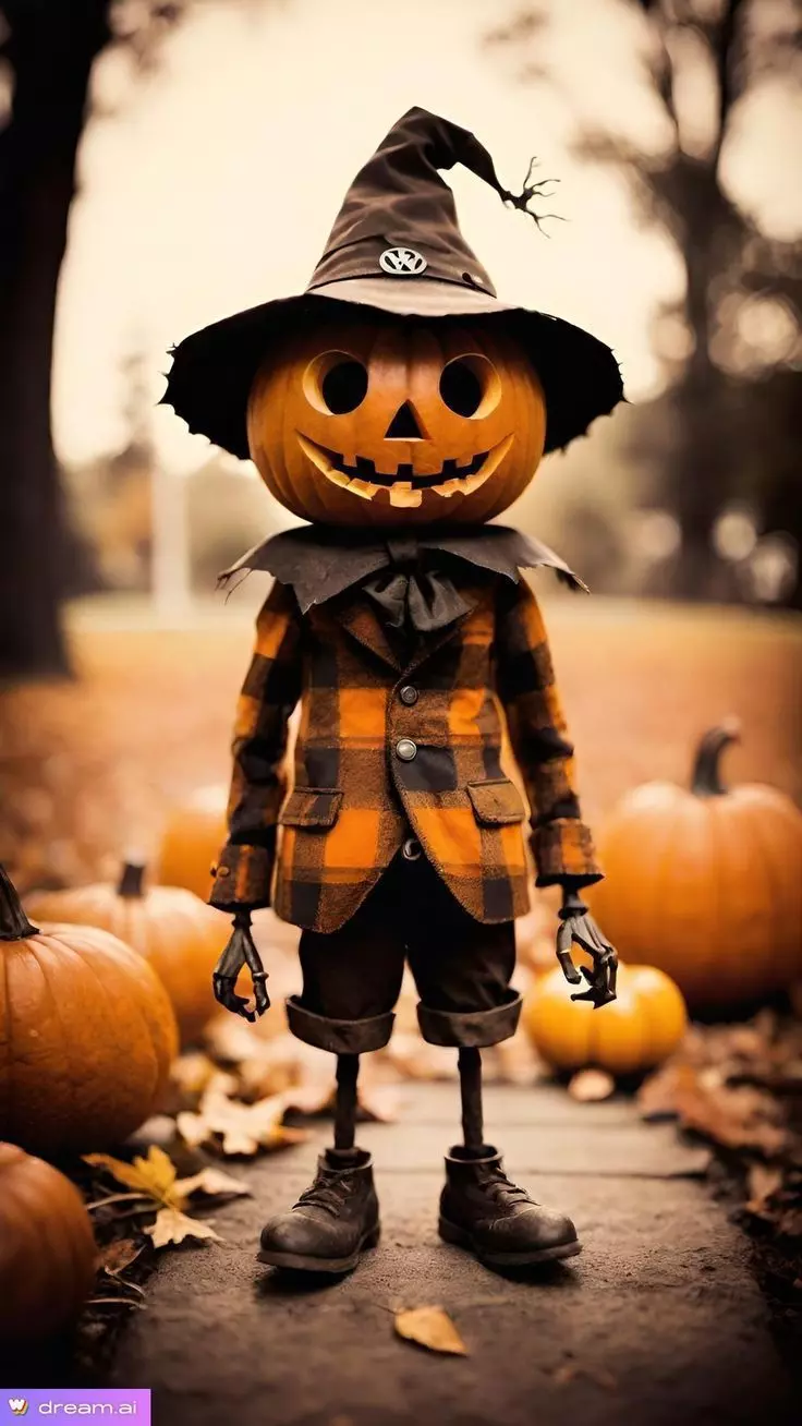 This charming 3D render features a whimsical pumpkin-headed scarecrow, blending rustic autumn charm with playful Halloween spirit. The character’s head is a classic jack-o’-lantern with large, round eye holes and a wide, toothy grin that glows warmly from within — radiating friendliness rather than fear. Perched atop its head is a slightly tattered black witch’s hat, adorned with a small silver buckle featuring a subtle emblem — adding a touch of magical flair. The scarecrow’s body is dressed in a cozy orange-and-black plaid jacket over dark trousers, complete with rolled cuffs and sturdy lace-up boots — evoking the look of a cheerful farmhand or a vintage Halloween doll.