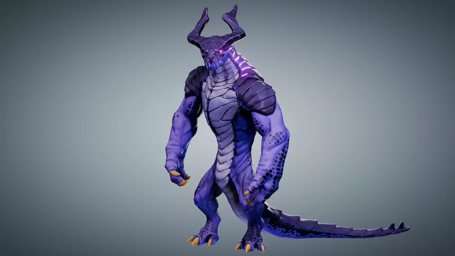 The Dark Baronto, a monstrous descendant of dragons, shimmers with dark purple scales, a hint at the shadowy power coursing through its veins. Two great, curved horns adorn its head, perfect for combat or display. Built for agility, its slender frame and powerful legs propel it with impressive speed and nimbleness, allowing it to navigate treacherous landscapes with ease. Though the exact nature of its darkness remains a mystery, whispers speak of its ability to manipulate shadows, unleash fire, or even control minds with its malevolent will.