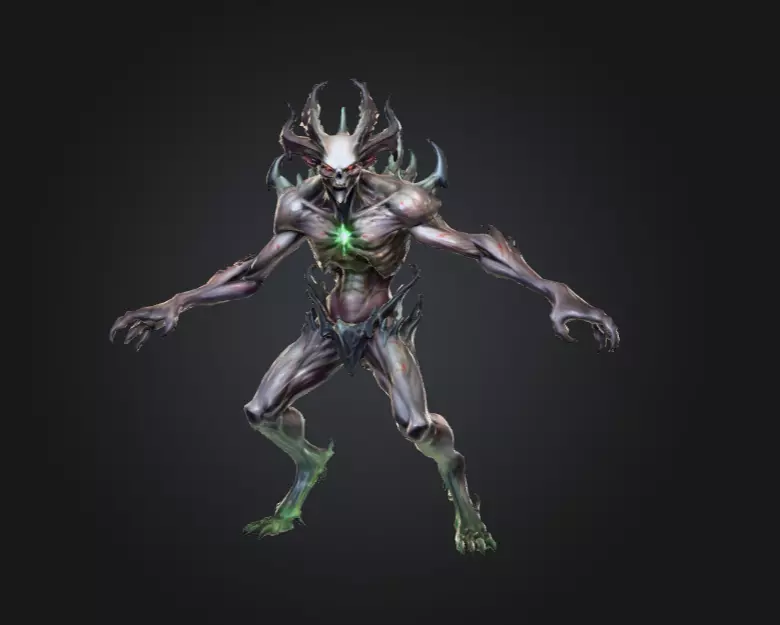Material definition enhances its alien and demonic qualities. Subtle iridescence across the skin, cracked bone elements, and dark glossy surfaces reinforce the hybrid organic-supernatural identity. This combination allows the model to thrive in environments filled with toxic magic, hellish atmospheres, or arcane laboratories.