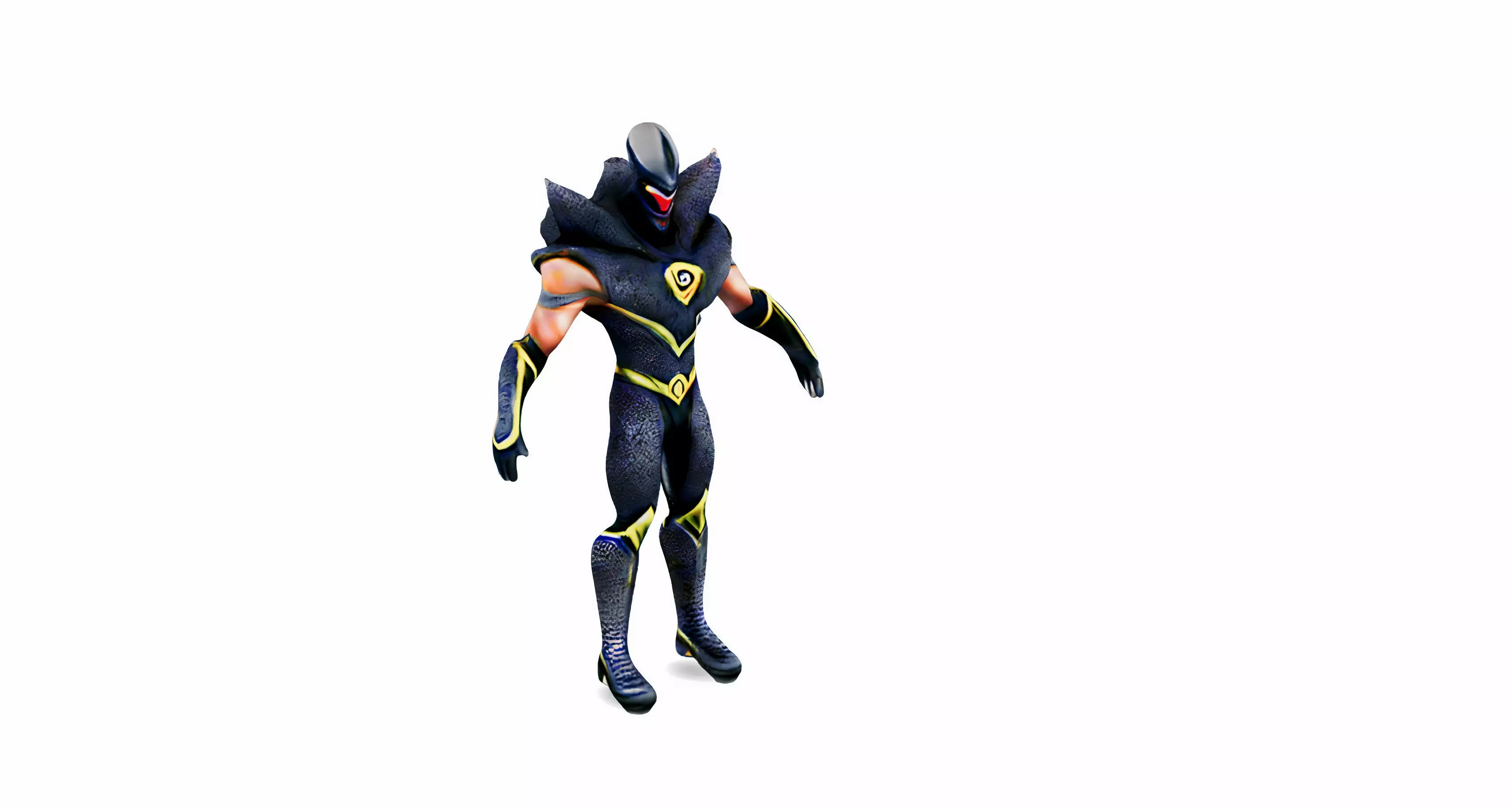 The 3D model depicted in the images is a highly detailed representation of a character known as the Dark Guardian. It is an intricate design that features a muscular figure clad in a textured suit that resembles a combination of traditional superhero attire with futuristic elements. The suit is predominantly dark with accents of yellow and gray, and the character's face is obscured by a helmet with a visor, giving it an enigmatic appearance. The model is designed with a dynamic pose that conveys power and readiness for action, suggesting that this character is possibly a vigilante or a hero in its narrative context.