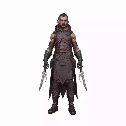 This meticulously crafted 3D model captures a lithe and cunning blood elf rogue, embodying the sleek ferocity of Azeroth's shadowy assassins. With fair, porcelain-like skin glowing under fel-green eyes that pierce like emeralds in the night, his sharp, angular features and pierced ears exude an aura of elegant menace. Short, slicked-back black hair with precisely trimmed sideburns frames his face, while dark leather armor, embossed with intricate crimson accents, hugs his agile frame. A hooded cape drapes mysteriously over his shoulders, paired with fingerless gloves concealing razor-sharp hidden blades, and soft-soled boots perfect for silent prowls. He dual-wields ornate sin'dorei daggers, their blades etched with glowing runes and reflecting faint light, while poison vials dangle from his belt, their viscous green contents swirling ominously. Every detail—from the creased leather textures and metallic sheen on the weapons to the subtle veins in his skin and the fluid motion of his cape—is rendered with hyper-realistic precision, ideal for animations, games, or collectibles in the World of Warcraft universe.