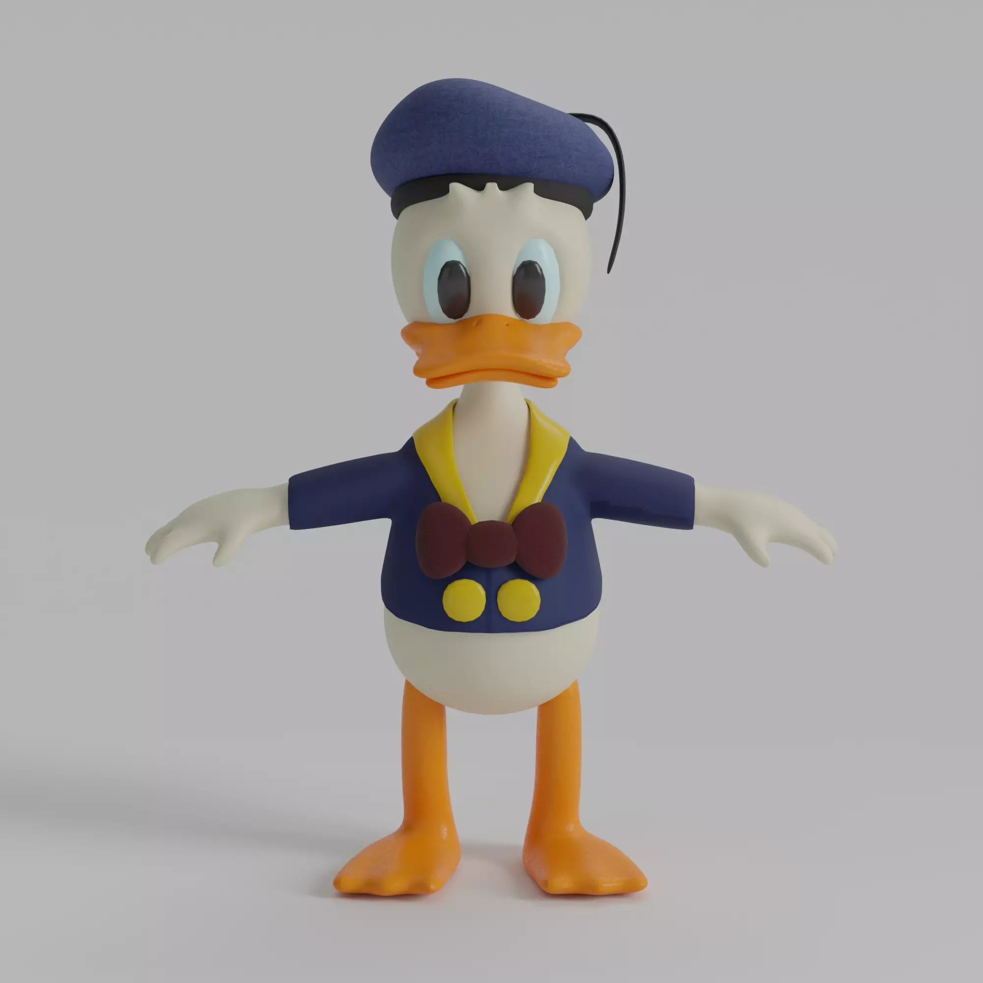 This is a high-quality 3D model of a cartoon duck character inspired by classic animated designs. The character features a humanoid duck form with a white-feathered body, large expressive eyes, and an orange beak and webbed feet. The duck is dressed in a blue sailor jacket with yellow buttons, a red bowtie, and a matching blue beret-style hat with a black ribbon.