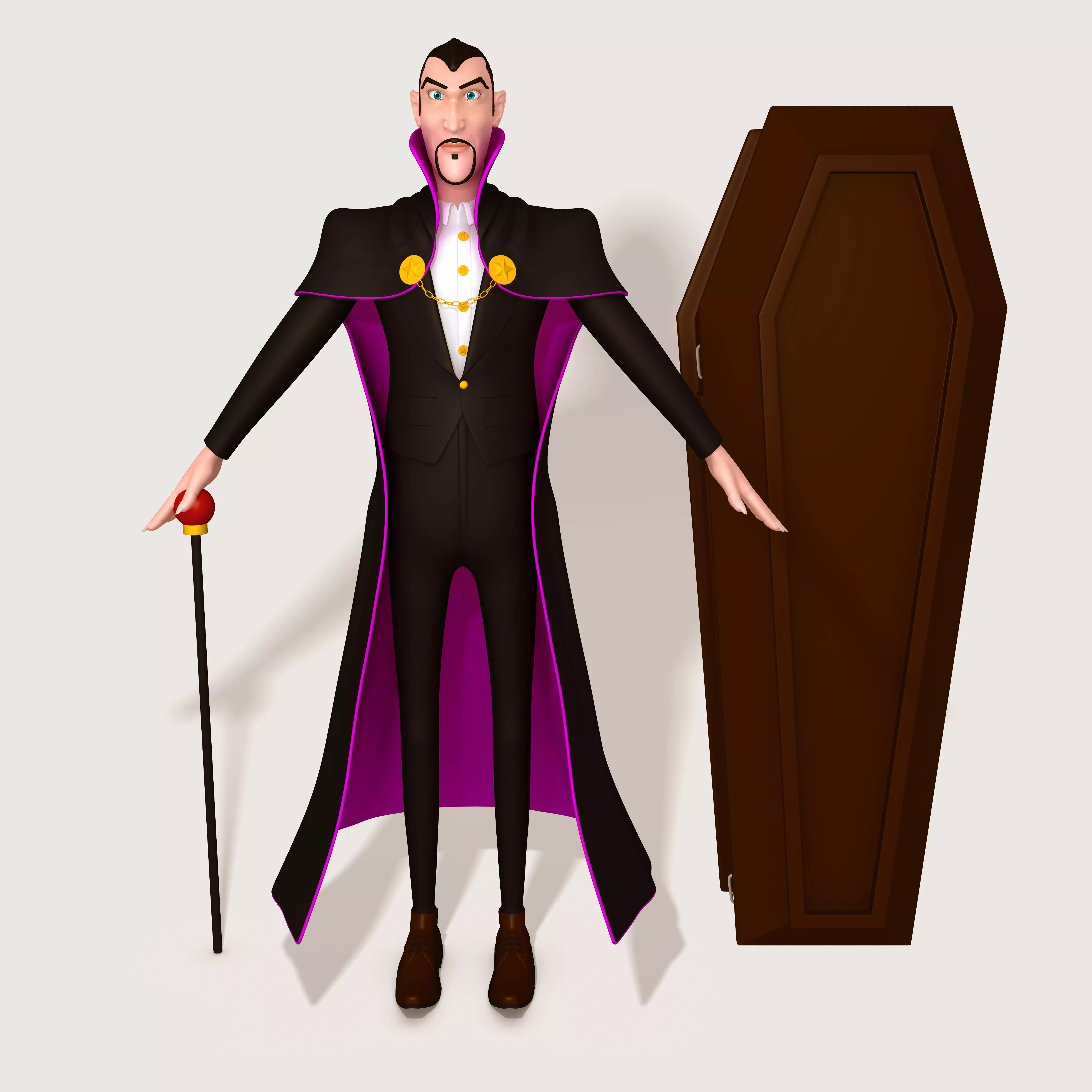 A high-quality cartoon Dracula character made in Maya 2018. The model has high detail textures and many advanced controls, both on the body and the face. This is a lovely cartoony style 3D model great for advertisements, feature films, presentations, games, software applications, print.