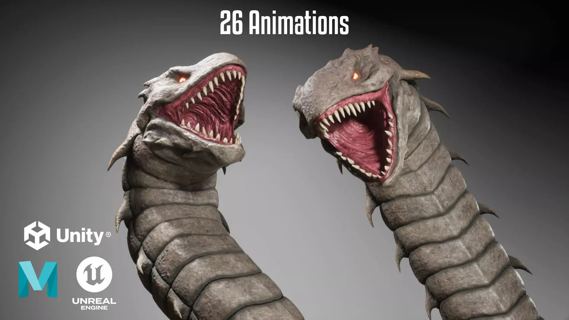 This pack focuses on encounter-ready animations: burrow in/out, multiple attack variations, strong hit reactions, two posture states (upright and snake/ground), plus grab and throw and a clear death animation for finishing the fight.