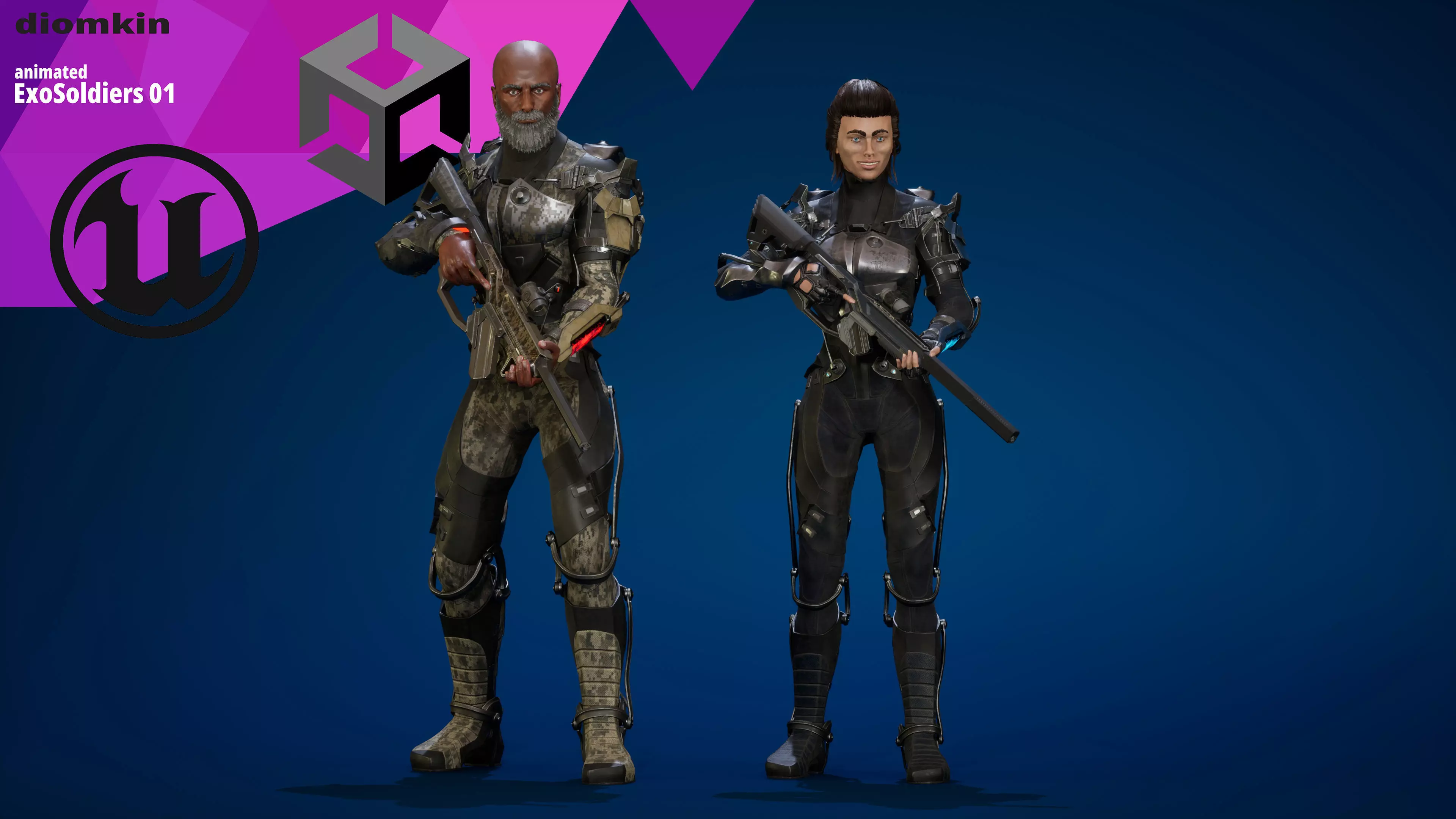The ExoSoldiers models contains 6 skins, 30 materials, 194 PBR textures 4096x4096, 61 animations, blendshapes, EpicSkeleton 5 + extra bones: joint_weapone-joint_weapone1. joint_Hair1-joint_Hair2-joint_Hair3-joint_Hair4-joint_Hair5-joint_Hair6.
