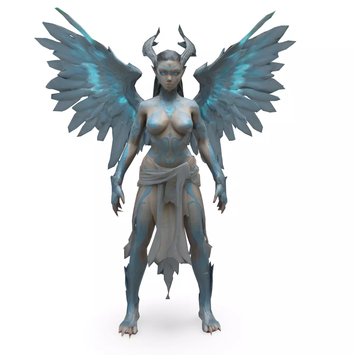 A highly detailed fantasy character representing a fallen angel queen. Featuring majestic glowing wings, horned crown, intricate tattoos, and a fearsome presence. This character blends elegance and menace, perfect for dark fantasy, RPG bosses, cinematic trailers, or antagonist roles.