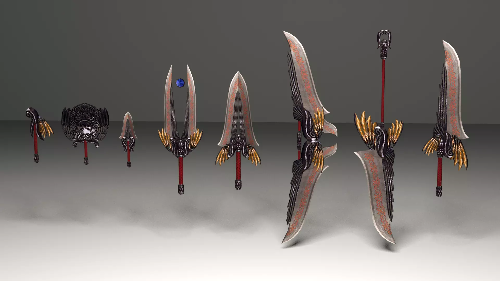 The set of black gold weapons are low poly 3d models for your game projects like MMORPG, strategy, third person, fantasy, etc.There are 2 included texture versions.The models were originally modeled in 3ds Max 2012 and rendered with Mental Ray.You can easily use these models in your fantasy games, for your characters.Renders have no postprocessing.