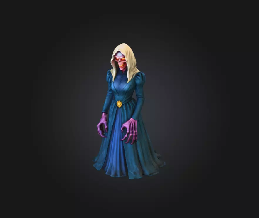 Female Dark Elegance embodies the chilling sophistication of a mysterious entity draped in an aura of refined malevolence. Standing tall in her flowing midnight-blue gown, she radiates a haunting grace that blurs the line between beauty and dread. Her delicate yet unnervingly elongated purple hands hint at a power both ancient and forbidden, while her skeletal face—half-concealed beneath a pale hood—adds an unsettling contrast to the elegance of her attire. With every step, she carries an air of tragic nobility, as if she once walked among royalty before being consumed by a dark force that reshaped her very essence.