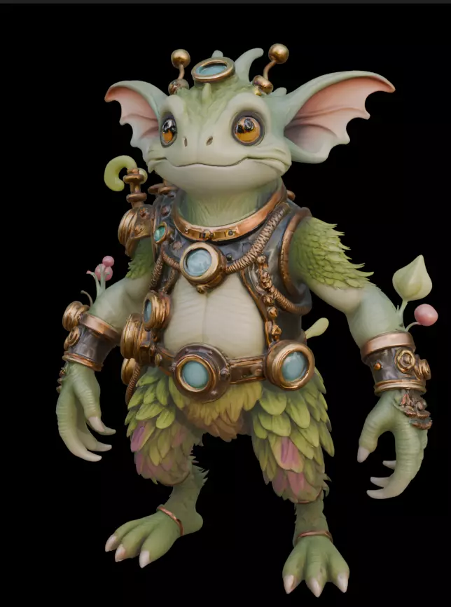Featuring expressive eyes, leaf-textured limbs, bioluminescent sprouts, and ornate brass mechanisms with gemstone inlays, this model is perfect for 3D printing, animation projects, collectible figures, tabletop RPGs, concept art, or game prototyping.The sculpt is clean, polished, and production-ready, offering excellent detail while maintaining friendly, approachable proportions.
