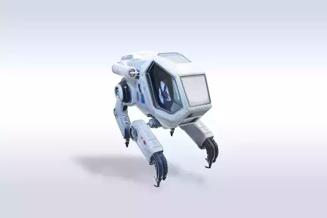 This is a high-quality futuristic sci-fi robot vehicle 3D model featuring a compact robotic pilot inside a transparent cockpit and advanced mechanical arms with energy modules. The design is ideal for games, cinematic renders, animations, AR/VR, concept visualization, and 3D printing.